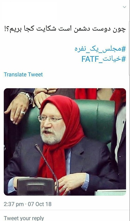 لاریجانی در جلسه مذکور، پاسخ دفتر رهبر معظم انقلاب مبنی بر عدم مخالفت ایشان با بررسی لوایح مربوط به ‏FATF‏ را قرائت ‏کرد که از نگاه اصولگرایان مخالف این لوایح، تاثیر فراوانی در تصویب ‏CFT‏ داشت. ‏ در کنار تعابیر زننده ای که علیه لاریجانی به کار رفت، برخی فعالان اصولگرا حتی تصویر لاریجانی هم را هم به شکل های ‏توهین آمیزی تغییر دادند. از جمله برخی از این افراد، تصویر لاریجانی را به شکل برخی زنان منافقین نشان دادند.‏ وزیر ارتباطات این واکنش ها را مورد اشاره قرار داده و از آن به عنوان «سلاح شیمیایی» ‏‎ ‎توسط خودی ها یاد کرده بود. ‏