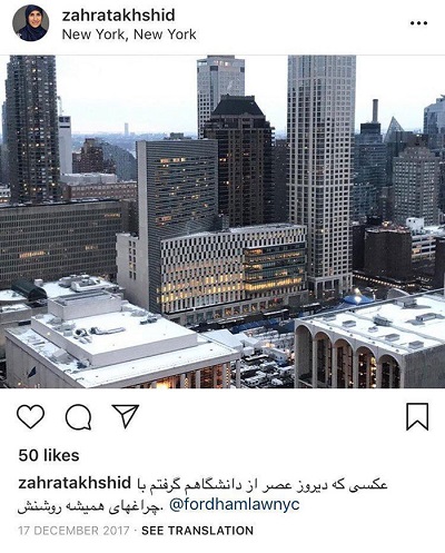 این عکس نمایی از دانشگاه فودرهام در منهتن نیویورک را نشان می‌دهد. زهرا تخشید فرزند محمد رضا تخشید استادیار گروه روابط بین‌الملل و رئیس دانشکده حقوق و علوم سیاسی دانشگاه تهران و نوه دختری آیت الله محمد یزدی است.