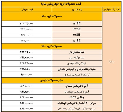 قیمت تیبا sx هم در قیمت گذاری جدید شرکت سایپا از 35 میلیون 765 هزار تومان به 39 میلیون و 425 هزار تومان و تیبا 2 با رینگ فولادی از 39 میلیون و 165 هزار تومان به 42 میلیون و 275 هزار تومان افزایش یافته است. علاوه بر این مطابق این لیست جدید، قیمت کوئیک گیربکس دستی ساده از 42 میلیون و 550 هزار تومان به 46 میلیون تومان و ساینا رینگ فولادی از 39 میلیون 840 هزار تومان به 44 میلیون 175 هزار تومان افزایش پیدا کرده است. لیست قیمت های جدید به شرح زیر است: