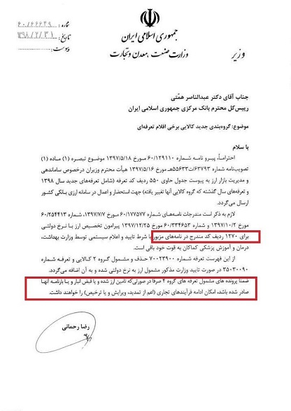 وزیر صنعت، معدن و تجارت در مکاتبه‌ای با رئیس کل بانک مرکزی، تأکید کرد، تخصیص ارز با نرخ دولتی برای 1270 قلم کالای پزشکی به شرط تایید سیستمی وزارت بهداشت در سال 98 نیز ادامه خواهد داشت.  در ادامه نیز به موضوع واردات کالاهای گروه 4 اشاره شده و آمده است، کالاهای اولویت ٤ که تأمین ارز شده و یا قبض انبار و بارنامه حمل برای آنها صادر شده، امکان ادامه فرایندهای تجاری (اعم از تمدید، ویرایش و یا ترخیص) را خواهند داشت.