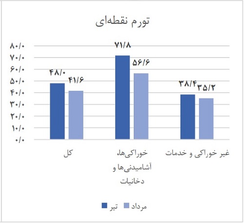 بر اساس این آمارها، نرخ تورم نقطه‌ای در مردادماه ۱۳۹۸ در مقایسه با ماه قبل ۶, ۴ واحد درصد کاهش یافته است. نرخ تورم نقطه‌ای گروه‌های عمده «خوراکی‌ها، آشامیدنی‌ها و دخانیات» و «کالاهای غیرخوراکی و خدمات» به ترتیب ۵۶, ۶ و ۳۵.۲ درصد بوده و نرخ تورم نقطه‌ای هر دو گروه عمده در مقایسه با ماه قبل کاهش داشته است.