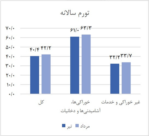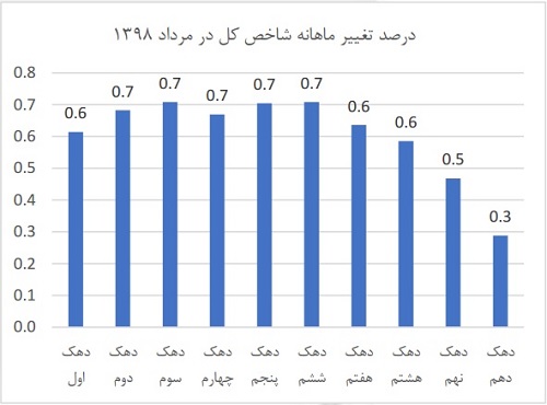 دامنه تغییرات نرخ تورم ماه مرداد سالانه در 1398 برای دهک‌های مختلف هزینه‌ای از 41.9 درصد برای دهک اول تا 44.8 درصد برای دهک دهم است. نمودار درصد تغییر شاخص نسبت به ماه قبل برای دهک‌های مختلف هزینه‌ای در شاخص کل و گروه‌های عمده «خوراکی‌ها، آشامیدنی‌ها و دخانیات» و گروه «غیرخوراکی و خدمات» به‌صورت زیر است: