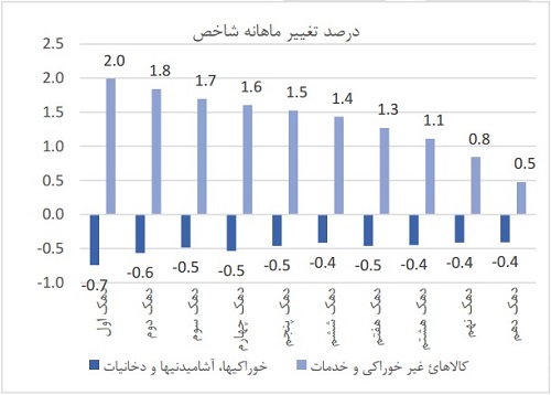همچنین گروه «سبزیجات» (لوبیا سبز، سیب‌زمینی، هویج‌فرنگی و گوجه‌فرنگی) و گروه «میوه و خشکبار» (میوه‌های فصل) نسبت به ماه قبل کاهش قیمت داشته است. در گروه عمده «کالاهای غیرخوراکی و خدمات» گروه «حمل‌ونقل» (انواع اتومبیل‌سواری) نسبت به ماه قبل کاهش قیمت داشته است.