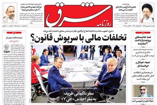 روزنامه شرق هم در صفحه اول خود به سفر ناگهانی ظریف پرداخته و از توافق سران گروه هفت برای کاهش تنش و مذاکرات جدید با ایارن نوشته است.