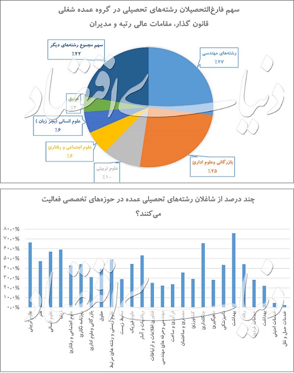 شاغلان تحصیلکرده در رشتههای «علوم اجتماعی و رفتاری» مانند علوم سیاسی، علوم اقتصادی و جامعهشناسی، تنها سهم ۴/ ۶ درصدی در بین مدیران داشتهاند. نکته تاملبرانگیز گزارش مرکز آمار، چگونگی فعالیت نیمی از شاغلان ۶ گروه تحصیلی در حوزه تخصصی خود است. یکی از ضعیفترین عملکردها مربوط به مهندسان است؛ تقریبا فقط یکپنجم آنها در حوزههای تخصصی مشغول بهکار بودهاند. در این زمینه، بیشترین توفیق را گروه «بهداشت» داشته است. بیش از سهچهارم شاغلان تحصیلکرده در حوزههای پزشکی، دندانپزشکی، داروسازی، مامایی، پرستاری و... در حوزه تخصصی شاغل هستند.