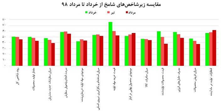 اما در خصوص شاخص شامخ در مردادماه 1398، تقریباً وضعیت تمامی متغیرهای تشکیلدهنده شاخص (بهجز متغیرهای سرعت انجام و تحویل سفارش و میزان استخدام و بهکارگیری نیروی انسانی) نسبت به ماه قبل بدتر شده است که نشان از رکود در بخش صنعت کشور دارد. پس از دو ماه ثبات، شاخص کل نیز وضعیت بدتری را نسبت به قبل به نمایش میگذارد که دراینبین ورود برخی کارخانهها به تعطیلات تابستانی مردادماه نیز بیتأثیر نبوده است. میزان کاهش در صادرات و فروش کالا به حدی بوده است که کاهش تولید پاسخگوی آن نبوده و منجر به افزایش موجودی انبار گشته است. قیمت مواد اولیه در مردادماه نسبت به ماه قبل تغییر زیادی نداشته اما موجودی آن همچنان کاهشی بوده است. رکود در سمت تقاضا نیز بهگونهای بوده که حتی کاهش قیمت محصولات تولیدی نتوانسته است منجر به افزایش سفارشات جدید و فروش شود. نکته جالبتوجه آن است فعالان اقتصادی اظهار داشتهاند که انتظار دارند تولید ماه آتی را افزایش دهند که شاید بتوان علت این خوشبینی را آرامش فعلی بازار ارز، برگشت مجدد به تولید پس از تعطیلات تابستانی و تحرکات سیاسی اخیر اروپا و تلاشهای دیپلماتیک ایران برای حفظ برجام دانست.