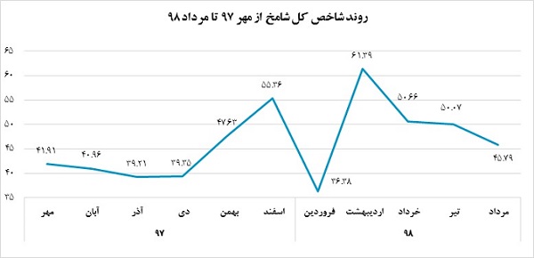 در گزارش شامخ مردادماه، پس از دو ماه ثبات، شاخص کل شامخ وضعیت بدتری را نسبت به قبل تجربه کرده؛ هرچند در این میان ورود برخی کارخانهها به تعطیلات تابستانی نیز بیتأثیر نبوده است. بااینوجود آمارها نشان میدهد کاهش در صادرات و فروش کالا به حدی بوده است که علیرغم کاهش در میزان تولید، به افزایش موجودی محصولات در انبارها منجر شده است.