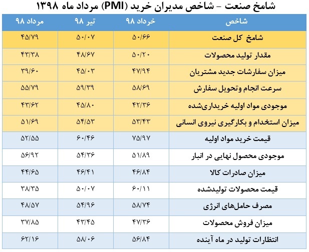 مرکز آمار و اطلاعات اقتصادی اتاق ایران، شاخص مدیران خرید (PMI) موسوم به شامخ را برای مردادماه امسال 45.79 واحد اعلام کرد که نسبت به شامخ ماه قبل 4.28 واحد معادل 8.54 درصد کاهش یافته است. این میزان افت میتواند نشانگر انتظار بازگشت رکود به فعالیتهای اقتصادی باشد هرچند ورود بخشی از صنعت به تعطیلات تابستانی نیز در این شاخص بیتأثیر نبوده است.