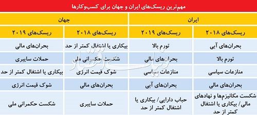 «مجمع جهانی اقتصاد» تازهترین گزارش ریسکهای منطقهای کسبوکارها را برای ۲۰۱۹ منتشر کرد. به گزارش مجمع، با تشدید ریسکهای اقتصادی و روزافزون شدن مخاطرات غیرمتمرکز، فهم منطقهای ریسکها و همچنین فرصتها برای همکاری میان مناطق بسیار اهمیت مییابد. در این رابطه اصلیترین ریسکهایی که در سطح جهانی موجب نگرانی کسبوکارها هستند به ترتیب عبارتند از: بحرانهای مالی، حملات سایبری، بیکاری یا اشتغال کمتر از حد، شوک قیمت انرژی، شکست حکمرانی ملی، بیثباتیهای اجتماعی گسترده، دزدی یا سوءاستفاده از اطلاعات، منازعات سیاسی، شکست زیرساختهای حیاتی و حباب داراییها. این رتبهبندی در حالی است که در گزارش سال گذشته دو ریسک رده نخست یعنی «بحرانهای مالی» و «حملات سایبری» به ترتیب در ردههای چهارم و پنجم قرار داشتند. یکی دیگر از نکات گزارش ریسک منطقهای «مجمع جهانی اقتصاد»، ریسک کسبوکارها برای هر یک ازکشورها است. به گزارش گروه اقتصاد بینالملل روزنامه «دنیای اقتصاد» بر این اساس پنج ریسک بزرگی که کسبوکارها در ایران با آن مواجهند به ترتیب عبارتند از: تورم بالا، بحرانهای مالی، درگیری بین دولتی، بحرانهای آبی، حباب دارایی و بیکاری و اشتغال کمتر از حد به طور مشترک در رده پنجم. در گزارش سال گذشته مهمترین ریسک اقتصادی ایران «بحران آبی» اعلام شده بود.
