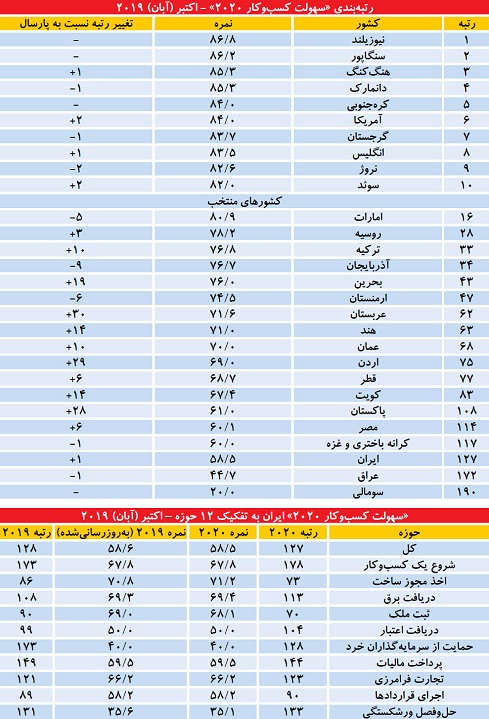 این در حالی است که سایر اقتصادهای خاورمیانه طی یک سال اخیر بیشترین اصلاحات مقرراتزدایی و تسهیل کسب وکار را در جهان داشتهاند، بهخصوص چهار کشور اردن، بحرین، عربستان و کویت؛ تا جایی که عربستان سعودی با ۳۰ پله صعود به جایگاه ۶۲ رسیده است. در گزارش امسال نیوزیلند با نمره ۸/ ۸۶ واحدی همچون سالهای گذشته بهعنوان بهترین کشور برای انجام کسب وکار در رده نخست ایستاده است. سه کشور شرق آسیایی سنگاپور، هنگکنگ و کرهجنوبی به همراه دانمارک رده چهارمی نیز سایر پنج کشور برتر گزارش «سهولت کسب وکار ۲۰۲۰» را تشکیل میدهند. در نهایت سومالی، اریتره، ونزوئلا، یمن و لیبی بدون تغییر جایگاه نسبت به گزارش سال گذشته، بدترین کشورهای جهان برای انجام کسب وکار لقب گرفتهاند.