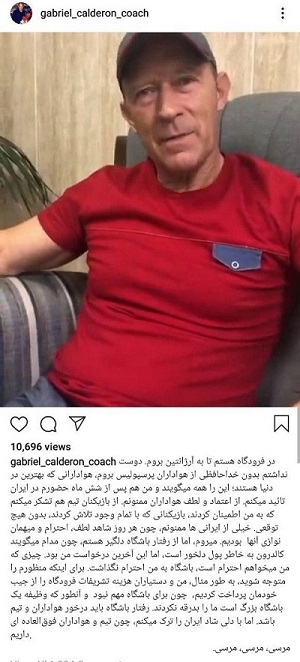 گابریل کالدرون، سرمربی پرسپولیس ایران را ترک کرد. او در پستی اینستاگرامی به زبان فارسی، از هواداران پرسپولیس خداحافظی کرد.