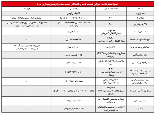 به گزارش روزنامه تعادل، در شصت‌و‌هفتمین نشست شورای گفت‌وگوی دولت وبخش خصوصی استان تهران، بررسی میزان خسارت کرونا بر رسته‌های کسب‌و‌کار در کشور از سوی نمایندگان دولت و بخش خصوصی حاضر در جلسه مطرح شد. براساس آمار اعلامی یداله صادقی رییس سازمان صنعت، معدن و تجارت استان تهران، از مجموع 17 هزار 500 واحد صنعتی در استان تهران که دارای پروانه بهره‌برداری بوده و مشغول به فعالیت هستند، 8 هزار واحد صنعتی متحمل خسارات شدید ناشی از کرونا شده‌اند. همچنین بررسی‌های سازمان صنعت، معدن و تجارت استان تهران نشان می‌دهد، به دنبال شیوع ویروس کرونا، تنها «صنایع غذایی و صنایع شوینده و بهداشتی» از کرونا در امان مانده و به دلیل جهش تقاضا طی این مدت، رشد نیز داشته‌اند و سایر صنایع آسیب‌های جدی دیده‌اند. در مقابل «صنایع پوشاک و کیف و کفش»، به عنوان بخش‌های اقتصادی یاد کرد که به دلیل شیوع ویروس کرونا در کشور، آسیب شدید دیده‌اند. بررسی‌ها همچنین نشان می‌دهد، «صنایع مرتبط با مصالح ساختمانی و معدنی و سایر صنایع غیرخوراکی از جمله لوازم شیشه‌ای، پلاستیکی، چاپ، برق و الکترونیک و نیز قطعات خودرو و خودرو» متضرر شده‌اند.