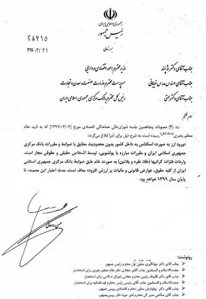 بر اساس این مصوبه، ورود ارز به صورت اسکناس به صورت نامحدود و طبق نظارت بانک مرکزی و همچنین واردات طلا، نقره و پلاتین خام با نظرات بانک مرکزی از هر گونه مالیات، حقوق و عوارض دولتی و همچنین مالیات بر ارزش افزوده معاف است.