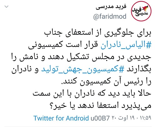 نقطه آغازین موضوع استعفا در توییتی با حساب کاربری «فرید مدرسی» قرار دارد. او کمتر از ۱۰ روز پیش توییت زد که «برای جلوگیری از استعفای جناب الیاس نادران قرار است کمیسیون جدیدی در مجلس تشکیل دهند و نامش را بگذارند کمیسیون جهش تولید و نادران را رئیس آن کمیسیون کنند. حالا باید دید که نادران این سمت را میپذیرد که استعفا ندهد یا خیر؟»