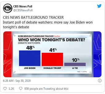 سیبیاس نیوز نوشت: پس از برگزاری یک مناظره پرهیاهو که مجری نمیتوانست دونالد ترامپ را آرام کند که صحبتهای جو بایدن و خودش را قطع نکند، ۴۸ درصد از تماشاچیان این مناظره بایدن را با پیروز دانستند و ۴۱ درصد هم به ترامپ رای دادند و ۱۰ درصد این مناظره را برابر ارزیابی کردند.
