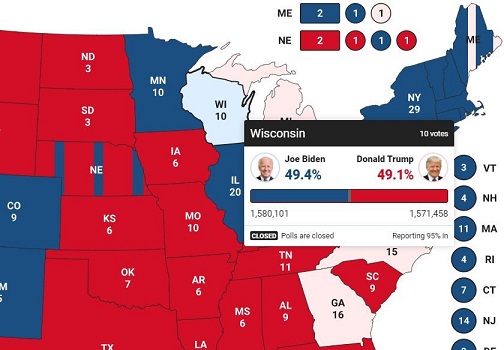 نتایج شمارش آرا انتخابات ریاست جمهوری 2020 آمریکا در ایالت ویسکانسین که تا دقایقی پیش به نفع ترامپ بود با ادامه شمارش ها به نفع بایدن تغییر کرد.