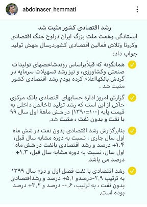 رییس کل بانک مرکزی افزود: بنابر گزارش رشد اقتصادی بدون نفت در ۶ ماه نخست سال جاری نسبت به دوره مشابه سال گذشته مثبت ۱.۴ درصد و رشد اقتصادی با نفت در ۶ ماه نخست سال نسبت به دوره مشابه سال گذشته مثبت ۱.۳ درصد است.