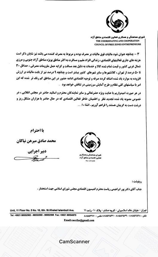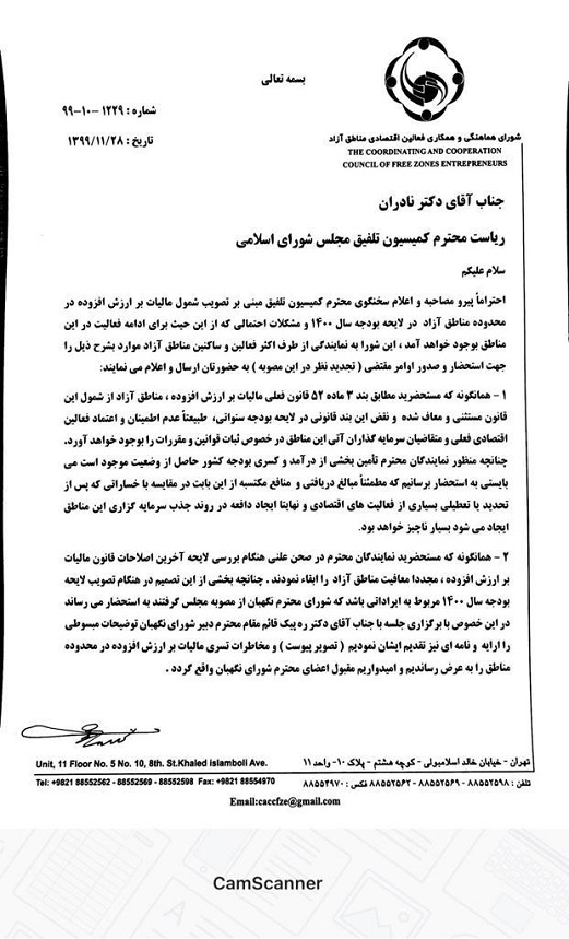 ۲. همانگونه که مستحضرید نمایندگان محترم در صحن علنی هنگام بررسی لایحه آخرین اصلاحات قانون مالیات بر ارزش افزوده ، مجددا معافیت مناطق آزاد را ابقاء نمودند . چنانچه بخشی از این تصمیم در هنگام تصویب لایحه بودجه سال ۱۴۰۰ مربوط به ایراداتی باشد که شورای محترم نگهبان از مصوبه مجلس گرفتند به استحضار می رساند در این خصوص با برگزاری جلسه با جناب آقای دکتر ره پیک قائم مقام محترم دبیر شورای نگهبان توضیحات مبسوطی را ارایه و نامه ای نیز تقدیم ایشان نمودیم ( تصویر پیوست ) و مخاطرات تسری مالیات بر ارزش افزوده در محدوده مناطق را به عرض رساندیم و امیدواریم مقبول اعضای محترم شورای نگهبان واقع گردد.