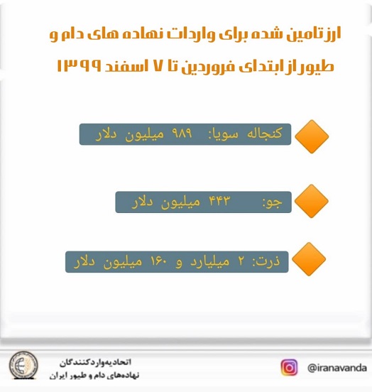 جزئیات ارز تامین شده برای این محصولات نشان می دهد، ارز تامین شده برای واردات «کنجاله سویا»، در بازه زمانی یاد شده،برابر با ۹۸۹ میلیون دلار بوده است. میزانی ارزی هم که برای واردات «جو» از ابتدایی سال تا هفتم اسفندماه ۹۹ اختصاص یافته، ۴۴۳ میلیون دلار گزارش شده است. همچنین مطابق آمار اعلامی، بیشترین میزان ارز تخصیص یافته برای واردات «ذرت» بوده است. به طوریکه ارز تامین شده برای واردات این محصول ۲ میلیارد و ۱۶۰ میلیون دلار بوده است.