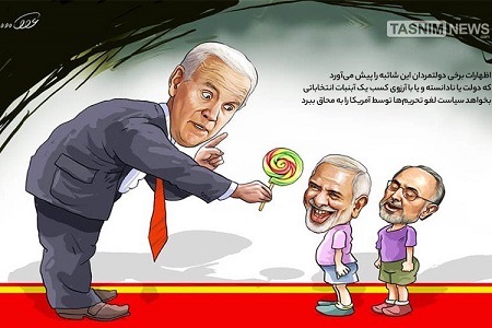 در کاریکاتور منتشر شده جو بایدن در حال دادن آبنبات به محمد جواد ظریف و علی اکبر صالحی وزیر خارجه و رییس سازمان انرژی اتمی است.  این کاریکاتور پس از آغاز نشست مهم وین و مذاکرات ایران و قدرت های جهانی حاضر در برجام منتشر شد.