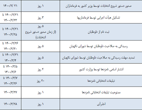 به گزارش فارس، بر اساس این جدول، صدور دستور برگزاری انتخابات ریاست جمهوری روز ۲۱ اردیبهشت خواهد بود و در همین روز ثبتنام از نامزدهای سیزدهمین دوره انتخابات ریاست جمهوری به مدت ۵ روز آغاز خواهد شد.