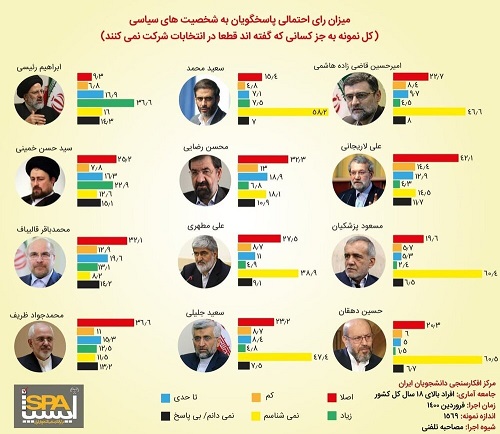 مرکز افکارسنجی دانشجویان ایران (ایسپا) در آخرین نظرسنجی خود (فروردین ۱۴۰۰) با جامعه آماری افراد بالای ۱۸ سال کل کشور و اندازه نمونه ۱۵۶۹ از طریق مصاحبه تلفنی میزان رای احتمالی مردم به شخصیت های سیاسی (در صورت کاندیدا شدن در انتخابات ریاست جمهوری سال ۱۴۰۰) را مورد سنجش قرار داده است. از مردم پرسیده شد «من اسم چند شخصیت سیاسی را می خوانم. اگر هر کدام کاندیدای ریاست جمهوری شوند تا چه حد احتمال دارد شما به هر یک از این افراد رای بدهید؟» نتایج در قالب نمودار به تفکیک شخصیت های سیاسی ارائه شده است.