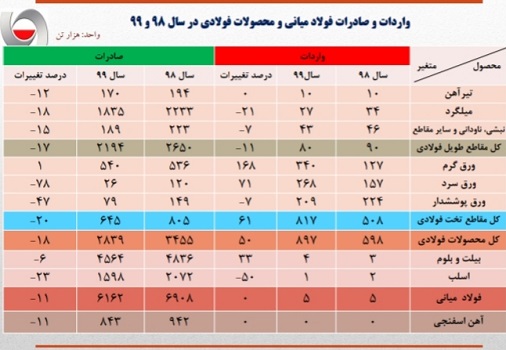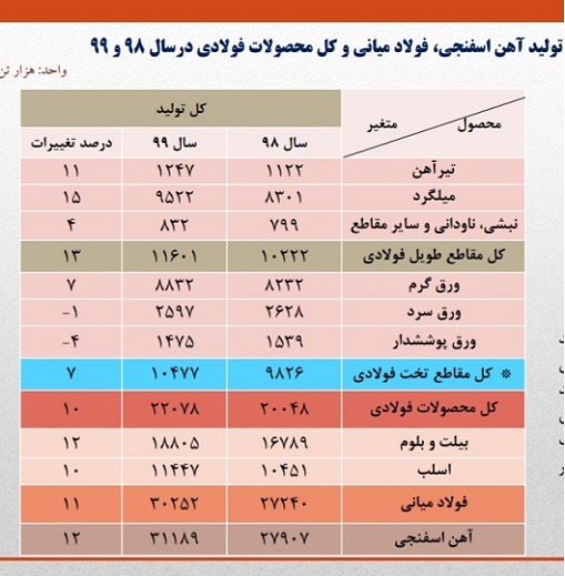 در سال ۹۹، با وجود تحریم و شیوع کرونا، بیش از سه میلیون تن به تولید فولاد کشور افزوده شد. بنابر آمارها، بیشترین نرخ رشد تولید در محصولات نوردی بهویژه میلگرد روی داده است. تولید میلگرد در کشور با رشد ۱۵ درصدی در سال ۹۹، با بیش از ۱.۲ میلیون تن افزایش نسبت به سال ۹۸ به ۹.۵ میلیون تن رسیده است. همچنین تولید بیلت و بلوم در سال ۹۹ نسبت به سال ۹۸، رشد ۱۲ درصدی و تولید اسلب، رشد ۱۰ درصدی را تجربه کرده است. طبق آمارهای انجمن تولید کنندگان فولاد، تولید آهن اسفنجی در سال ۹۹ تقریباً ۳۱.۲ میلیون تن رسیده که نسبت به سال ۹۸، حدود ۳.۳ میلیون تن معادل ۱۲ درصد افزایش داشته است. علیرغم قطعی گاز در زمستان، رشد تولید آهن اسفنجی بیش از رشد تولید فولاد میانی بوده که نکته مثبتی در جهت ایجاد توازن در زنجیره فولاد به شمار میرود.