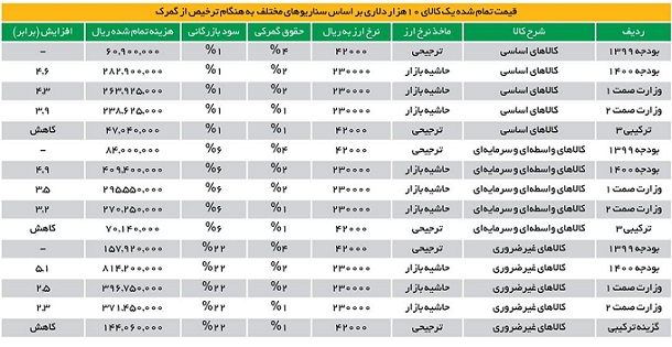 ۵. گزینه ترکیبی: محاسبه حقوق گمرکی بر اساس بودجه ۱۴۰۰ یعنی کالاهای اساسی با نرخ یکدرصد، سود بازرگانی سال ۱۳۹۹ بدون تخفیف به علاوه عوارض هلالاحمر و مالیات بر ارزش افزوده؛ برمبنای دلار ۴۲۰۰۰ریالی است.