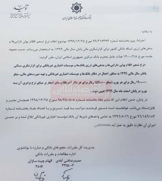 نرخ تسعیر اقلام پولی دارایی ها و بدهی های ارزی بانک ها و موسسات اعتباری غیر بانکی برای گزارشگری مالی پایان سال مالی ۱۳۹۹ به منظور اعمال در دفاتر بانک ها و موسسات اعتباری غیر بانکی و تهیه صورت مالی، مبلغ ۱۹۰۰۰۰ ریال برای هر یورو ( مبلغ ۱۵۹۰۰۰ ریال برای هر دلار آمریکا) و سایر اسعار بر مبنای نرخ برابری آن به یورو در پایان اسفند ۹۹ تعیین شود.