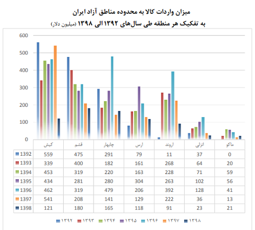 در بخش واردات هم اینطور نوشته شده است که مجموع واردات کالا به محدوده مناطق آزاد ایران طی سال‌های 1392 الی 1398 که به‌منظور مصرف، فروش و یا تولید در منطقه صورت‌گرفته 10.15 میلیارد دلار است که به‌صورت میانگین معادل 1.45 میلیارد دلار در سال است. با این حساب واردات کالا به محدوده مناطق آزاد بیش از 2 برابر صادرات این مناطق به خارج از کشور است. بیشترین واردات از طریق مناطق آزاد کیش، قشم و چابهار صورت می‌پذیرد و کمترین واردات مربوط به مناطق آزاد ماکو و انزلی است.
