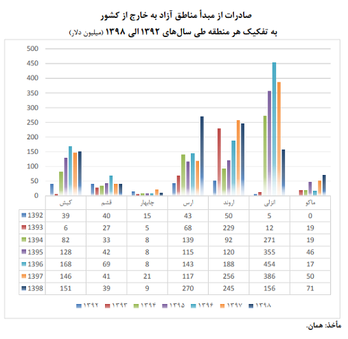 ارزیابی ها نشان می دهد، طی سال های ۹۲ تا ۹۸ مناطق آزاد «انزلی، اروند و ارس» بیشترین صادرات و مناطق آزاد «ماکو و چابهار» کمترین صادرات را به خود اختصاص داده‌اند؛ همچنین میزان صادرات مناطق آزاد به‌صورت میانگین طی سال‌های مورد بررسی حدود۷۱۷ میلیون دلار است.