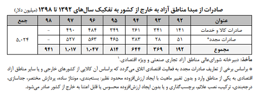 آمار صادرات کشور به تفکیک صادرات خدمات استخراج شده، مجموع صادرات مناطق آزاد با صادرات کل کشور مقایسه شده است. براین‌اساس صادرات مناطق آزاد در مقایسه با صادرات کشور بدون درنظرگرفتن صادرات مشتقات نفتی و میعانات گازی از سرزمین اصلی، حدود 2 درصد و در مقایسه با کل صادرات کشور حدود 1 درصد است.