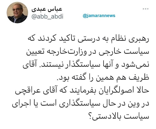 عباس عبدی در توئیتی نوشت: رهبری نظام به درستی تاکید کردند که سیاست خارجی در وزارت خارجه تعیین نمیشود و آنها سیاستگذار نیستند.