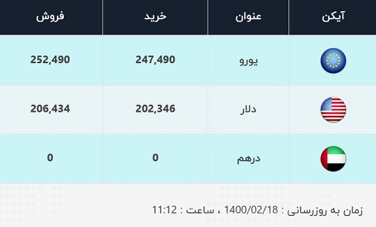 قیمت فروش یورو نیز در صرافیهای بانکها، ۲۵۲۴۹۰ ریال و نرخ خرید آن ۲۴۷۴۹۰ ریال اعلام شده است.