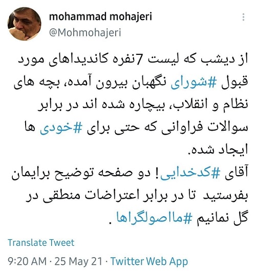 محمد مهاجری، روزنامه‌نگار اصولگرا در واکنش به فهرست انتخاباتی هفت‌نفره نامزد‌های انتخابات ریاست‌جمهوری نوشت: از دیشب که لیست هفت نفره کاندیدا‌های مورد قبول شورای نگهبان بیرون آمده، بچه‌های نظام و انقلاب بیچاره شده‌اند در برابر سوالاتی که حتی برای خودی‌ها ایجاد شده؛ آقای کدخدایی دو صفحه توضیح برایمان بفرستید تا در برابر اعتراضات منطقی در گِل نمانیم ما اصولگراها.