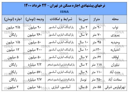 بانک مرکزی در گزارش اردیبهشت ماه ۱۴۰۰ آمار رشد اجارهبها نسبت به ماه مشابه سال قبل در تهران را ۳۲.۶ درصد و در دیگر مناطق شهری ۳۶.۳ درصد اعلام کرد. گزارشهای میدانی نیز حاکی از آن است که در برخی موارد، صاحبخانهها در تهران بیش از ۵۰ درصد نرخ اجاره را بالا بردند.