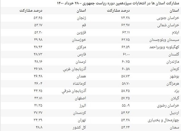 بر اساس اعلام رئیس ستاد انتخابات کشور، جدول میزان مشارکت در انتخابات ۲۸ خرداد ۱۴۰۰ به تفکیک ۳۱ استان کشور، بدین شرح است: