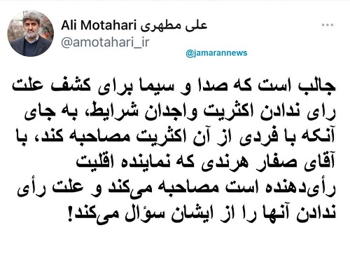 علی مطهری در توئیتی نوشت: جالب است که صدا و سیما برای کشف علت رای ندادن اکثریت واجدان شرایط، به جای آنکه با فردی از آن اکثریت مصاحبه کند، با آقای صفارهرندی که نماینده اقلیت رای دهنده است مصاحبه میکند و علت رای ندادن آنها را از ایشان سوال میکند.