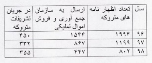 اکبرپور در مورد سال ۹۷ نیز گفت: ۱۱۹۹ اظهارنامه متروکه به ثبت رسیده که ۸۶۷ اظهارنامه به اموال تملیکی ارسال شده و ۳۳۲ اظهارنامه نیز در جریان تشریفات متروکه هستند. در سال ۹۸ نیز ۸۰۲ مورد اظهارنامه متروکه وجود داشت که ۴۴۷ اظهارنامه به سازمان اموال تملیکی ارسال شد و ۳۵۵ اظهارنامه نیز در جریان تشریفات متروکه قرار دارد.