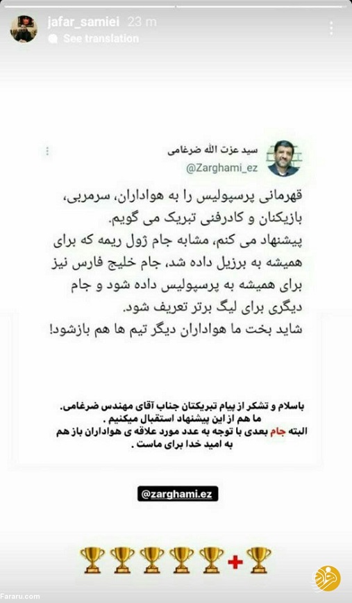 بعد از پنجمین قهرمانی متوالی پرسپولیس در رقابت‌های لیگ برتر ایران عزت الله ضرغامی، رییس سابق صداوسیما، در توییتر خود پس از تبریک قهرمانی پرسپولیس، پیشنهاد کرد که جام خلیج فارس برای همیشه به نام پرسپولیس ثبت شود و یک جام دیگر درنظر گرفته شود تا به قول خودش شاید بخت قهرمانی برای دیگر تیم‌ها هم باز شود.