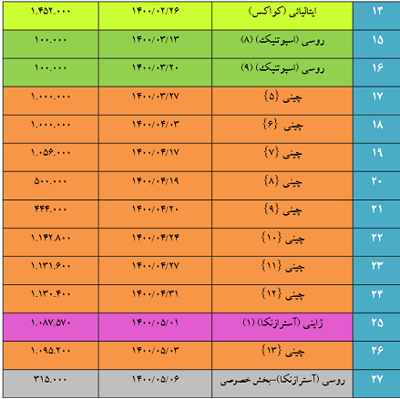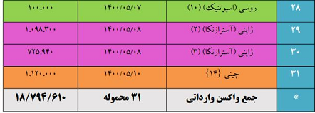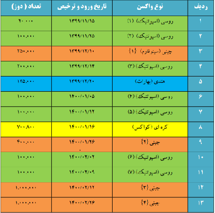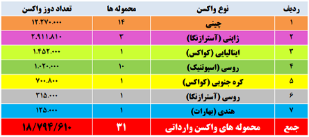 بنابر آمار اعلامی، واکسن های وارداتی بیشتر از کشور «چین، روسیه، ژاپن، هند، کره حنوبی» بوده است.