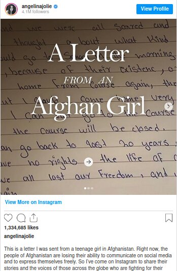 جولی در توضیح آن نوشته است:‌ «هم اکنون مردم افغانستان در حال از دست دادن امکان برقراری ارتباط و آزادی بیان در شبکه‌های اجتماعی هستند. من به اینستاگرام آمدم تا صدای کسانی باشم که در سراسر جهان برای حقوق اولیه انسانی‌شان مبارزه می‌کنند.»