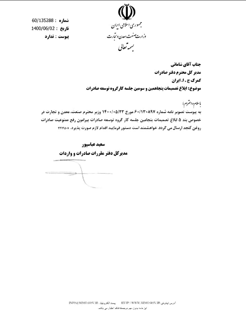 سعید عباسپر مدیرکل دفتر مقررات صادرات و واردات وزارت صنعت، معدن و تجارت مصوبه پنجاهمین جلسه توسعه صادرات مبنی بر لغو ممنوعیت صادرات روغن کنجد را به علی اکبر شامانی مدیرکل دفتر صادرات گمرک ایران ابلاغ کرد.