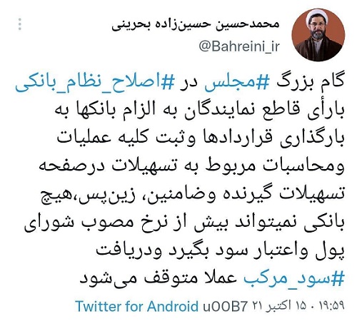 محمدحسین حسین زاده بحرینی در توییتر اعلام کرد: گام بزرگ مجلس در اصلاح نظام بانکی با رای قاطع نمایندگان به الزام بانک ها برای بارگذاری قراردادها و ثبت کلیه عملیات و محاسبات مربوط به تسهیلات در صفحه تسهیلات گیرنده و ضامنین .