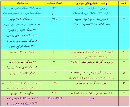 تعداد خودروهای سواری ترخیص شده تا پایان مهلت مصوبه شمارۀ ۱۵۲۶۷۶/ت ۵۷۳۹۴ مورخ بیست ونهم بهمن ماه سال ۱۳۹۸ برابر ۲هزار و ۸۵۹ دستگاه بوده که یک هزار دستگاه مربوط به شرکت کرمان موتور ، ۳۴۰ دستگاه مربوط سایر اشخاص براساس اظهارقبلی، ۱۴۵ دستگاه مربوط به خودروهای اروندی، ۴ دستگاه سهمیه جانبازان معزز و ۱۲۰۰ دستگاه مربوط به مراجع قضایی و ۱۷۰دستگاه دیگر نیز اظهار و ترخیص شده است.