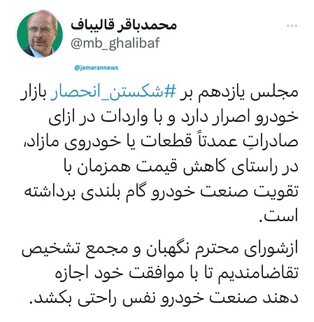 محمدباقر قالیباف، رئیس مجلس شورای اسلامی، در حساب شخصی خود در توییتر نوشت: «مجلس یازدهم بر شکستن انحصار بازار خودرو اصرار دارد و با واردات در ازای صادراتِ عمدتاً قطعات یا خودروی مازاد، در راستای کاهش قیمت همزمان با تقویت صنعت خودرو گام بلندی برداشته است.