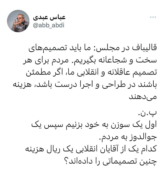عباس عبدی فعال سیاسی اصلاح طلب در حساب کابری توئیتر خود نوشت: «قالیباف در مجلس: «ما باید تصمیمهای سخت و شجاعانه بگیریم. مردم برای هر تصمیم عاقلانه و انقلابی ما اگر مطمئن باشند در طراحی و اجرا درست باشد، هزینه میدهند.» اول یک سوزن به خودمان بزنیم سپس یک جوالدوز به مردم. کدام یک از آقایان انقلابی یک ریال هزینه چنین تصمیماتی را داده اند؟»