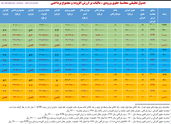 اگر فرض براین باشد که ارزش واردات بخشی از یک کالای وارداتی حدود ۱۰ هزار دلار است آنگاه برای کالاها و اقلام مرتبط با تولید (رنگ سبز در جدول) براساس قانون بودجه ۱۳۹۹، حقوق گمرکی یک میلیون و ۶۸۰ هزار تومان، سود بازرگانی ۴۲۰ هزار تومان، عوارض هلال احمر ۲۱ هزار تومان و مالیات بر ارزش افزوده ۳.۹ میلیون تومان است که مجموع پرداختی ۶.۹ میلیون تومان خواهد بود.