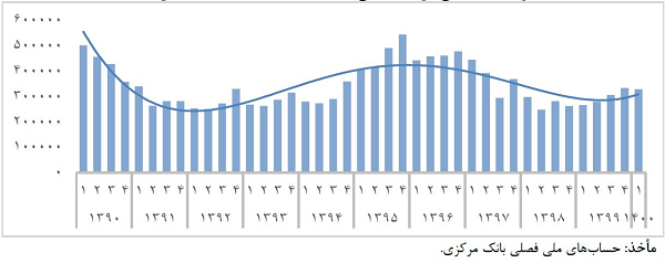 همانطور که در نمودار 1 مشاهده میشود، ارزش افزوده این بخش در سال 1395 به سطح ارزش افزوده آن در سال 1390 رسیده که میتواند به معنای تکمیل ظرفیتهای خالی تولید این بخش تفسیر شود. در سال 1399 نیز شاهد روند صعودی ارزش افزوده بخش نفت و گاز به خصوص در دو فصل پایانی سال هستیم، ولی مقایسه با سال 1395 نشانگر وجود ظرفیت خالی قابل توجه در این بخش است.