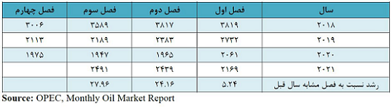 آمارهای سازمان اوپک از منابع ثانویه از سال 2018 در جدول 1 ارائه شده است. همانطور که جدول 1 نشان میدهد، تولید نفت ایران در فصول 2 و 3 سال 2021 (بهار و تابستان 1400 ) به ترتیب حدود 2.44 و 2.49 میلیون بشکه در روز بوده است که با در نظر گرفتن مصرف حدود 1.7 میلیون بشکهای روزانه نفت خام در داخل به معنای صادرات 770 و 820 هزار بشکهای روزانه نفت خام در این فصول است.